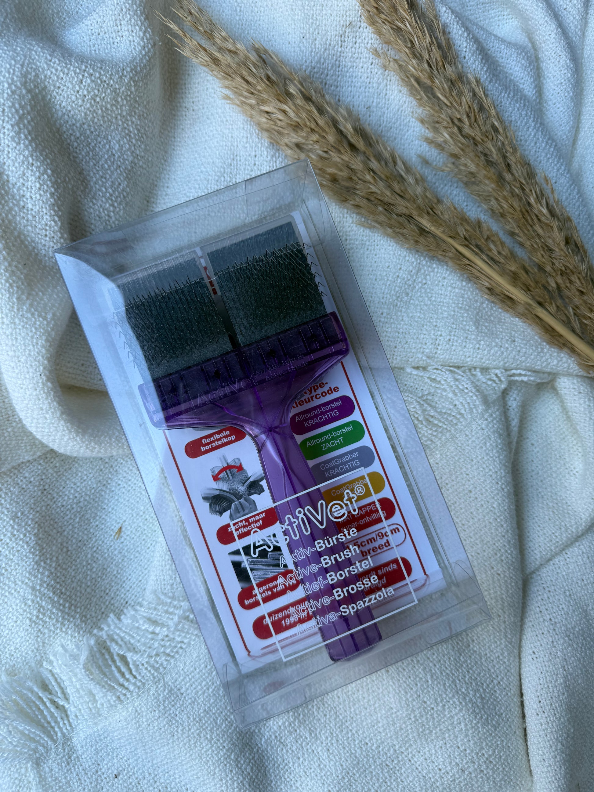 De Activet Paarse Borstel is het bed minder flexibel waardoor je soms beter door de dichte curly vachten komt en eventuele klitten eenvoudiger kunt verwijderen. Mits je de juiste borsteltechniek gebruikt. Deze borstelt dus harder en veert minder mee. Veel doodles ervaren hier, in combinatie met de verkeerde borsteltechniek, meer pijn door.