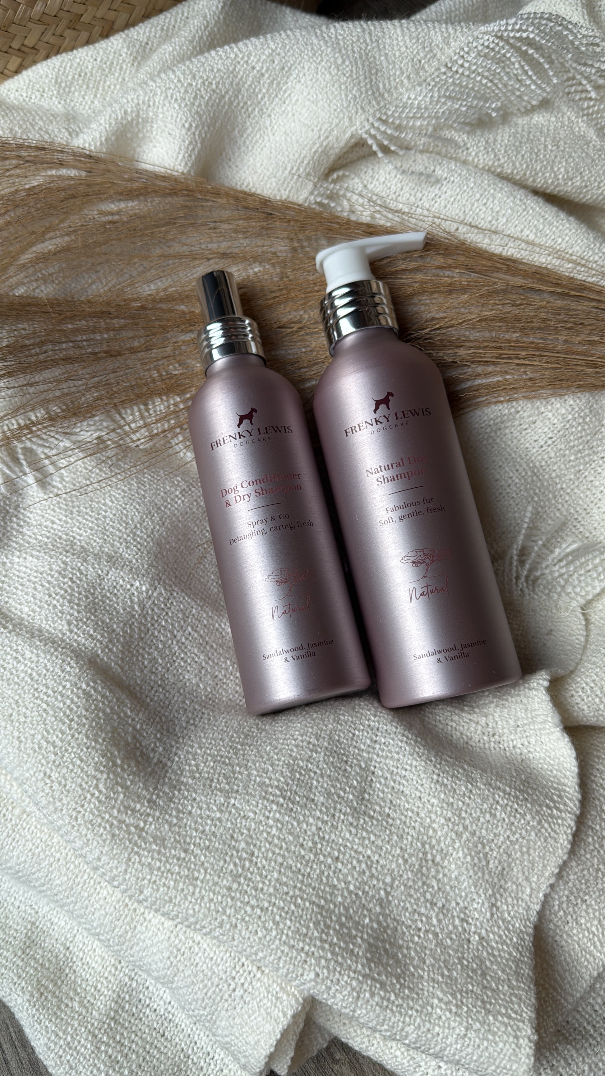 Geef de vacht van je Doodle de liefdevolle verzorging die het verdient met de Frenkie Lewis Duo! Dit speciale pakket combineert onze populaire Frenkie Lewis Shampoo met de handige Droogshampoo & Conditioner, voor een complete vachtroutine die jouw hond laat stralen. Of je nu toe bent aan een grondige wasbeurt of een snelle opfrisbeurt tussendoor, met deze duo zit je altijd goed.