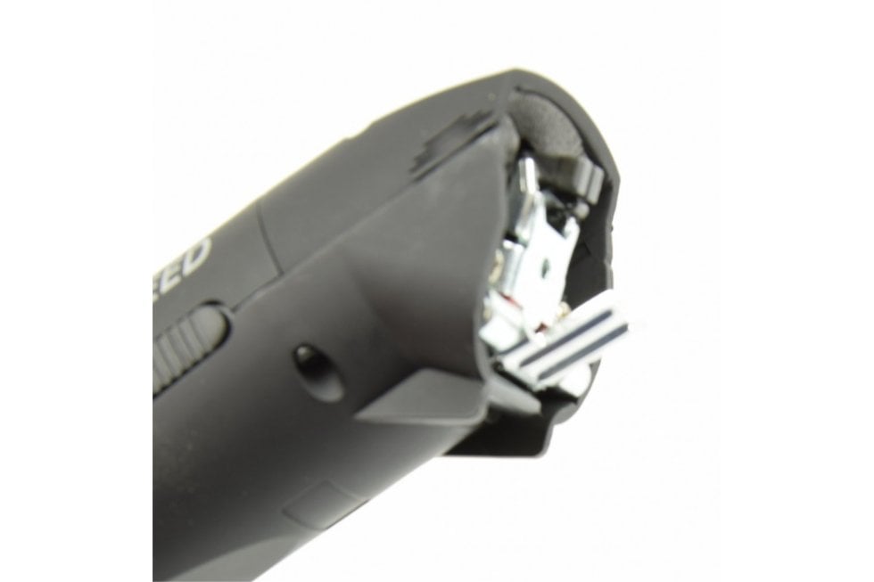 Schakelaar met twee posities wat je de mogelijkheid geeft te kiezen tussen 2800 t/p/m of 3500 t/p/m, voor licht (stand 2) of zwaar werk (stand 1). L Onderhoudsvrij, de inwendige delen behoeven geen olie of vet. Weegt slechts 330 gram (zonder scheerkop) De tondeuse werkt met losse scheerkoppen van het snap on systeem (niet bijgeleverd) dus makkelijk te verwisselen. Wordt geleverd met olie (voor scheerkoppen) en schoonmaak borstel inclusief GRATIS 1,5 mm scheerkop