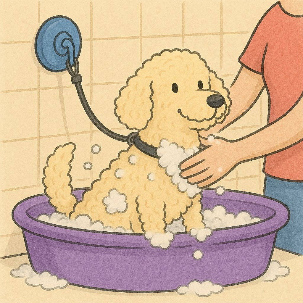 Bevestig de zuignap eenvoudig aan een glad oppervlak zoals tegels of de badrand. Aan de haak kun je een trimlus vastmaken die je om de hals van je hond bevestigt. Zo heb je beide handen vrij om je hond te wassen zonder stress of gedoe.